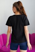 Модель изготовлена из кулирки с лайкрой качества пенье, а поэтому приятно прилегает к телу, находясь в ней кожа «дышит», а это необходимое условие при носке в жаркое время года. Футболка идеально сочетается с темными и синими джинсами. Горловина обработана окантовкой — аккуратно преподносит зону декольте, украсить ее можно небольшой подвеской. А набивка позволит вам оставаться в тренде, надевая любой низ.
