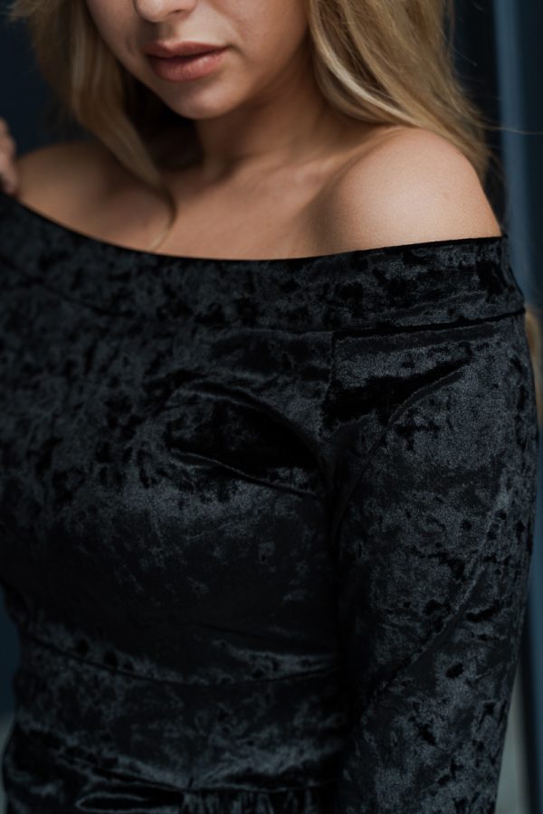 Элегантное, праздничное, приталенное бархатное платье, с рукавом 3/4 и округлым вырезом горловины. Чёрный цвет - для тех, кто предпочитает классику.