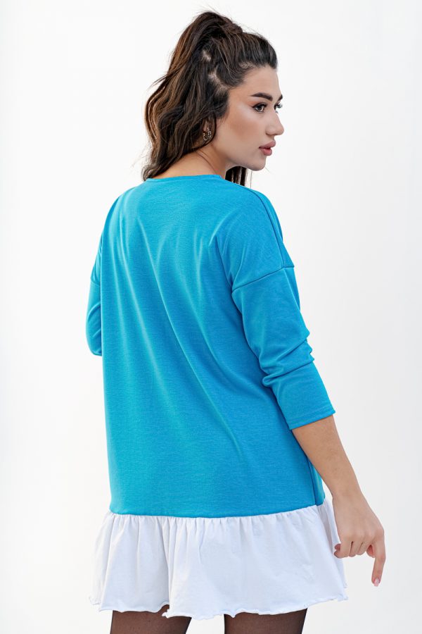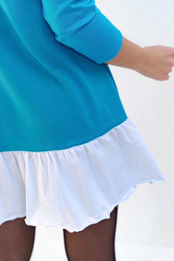 Романтичное женское платье свободного кроя бирюзового цвета с белой оборкой и рукавами 3/4.