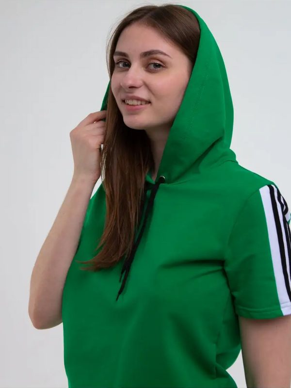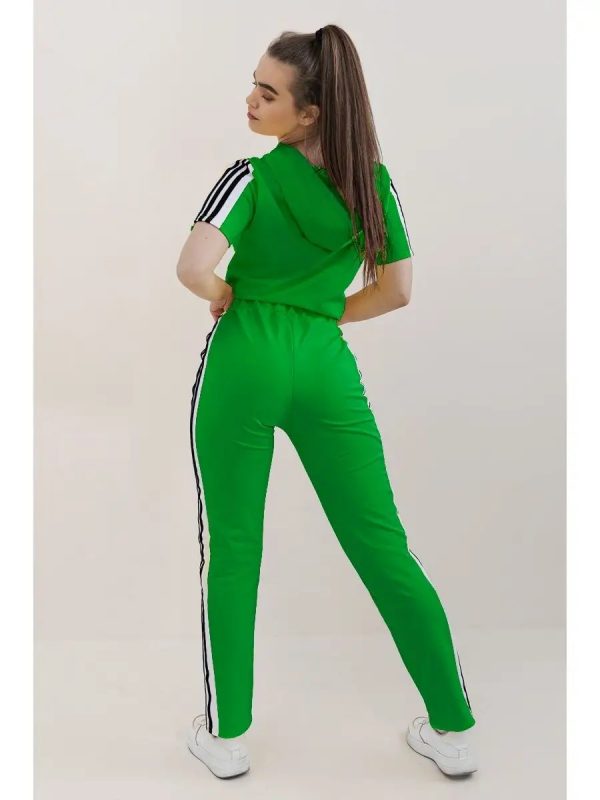 Модный, удобный спортивный женский костюм с капюшоном, карманами. Изготовлен из ткани — футер.
