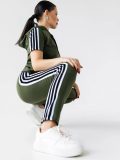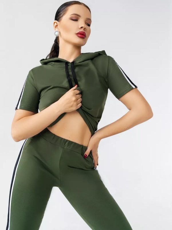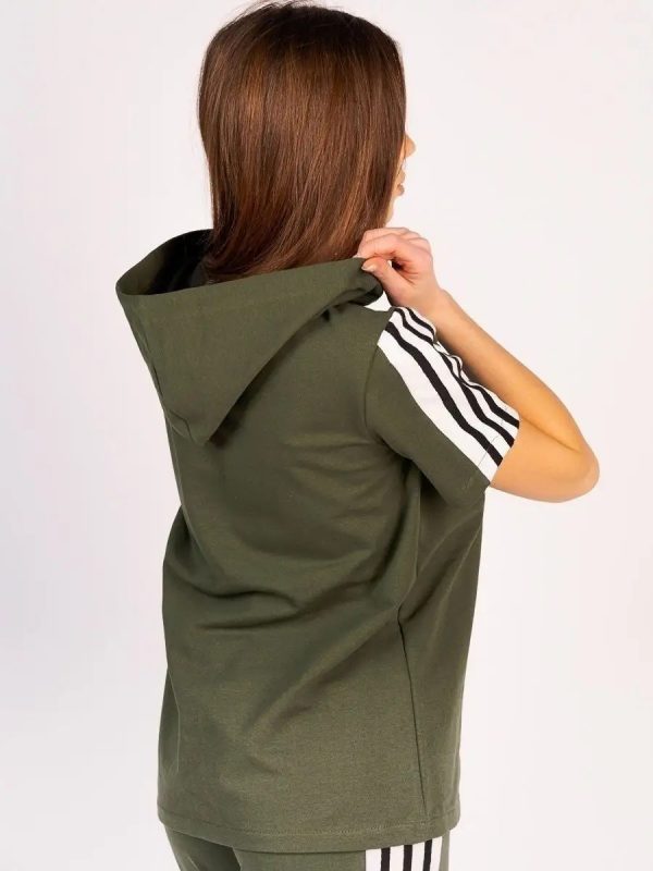 Модный, удобный спортивный женский костюм с капюшоном, карманами, цвета хаки. Изготовлен из ткани — футер с лайкрой.