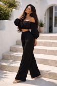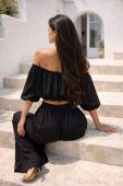 Легкая блуза с открытыми плечами добавляет образу романтичности и воздушности. Эластичная резинка на талии помогает подогнать блузу по фигуре, подчеркивая талию и создавая плавный силуэт. Свободный крой и объемные рукава делают этот костюм еще более легким и непринужденным, идеально подходящим для теплых летних дней.