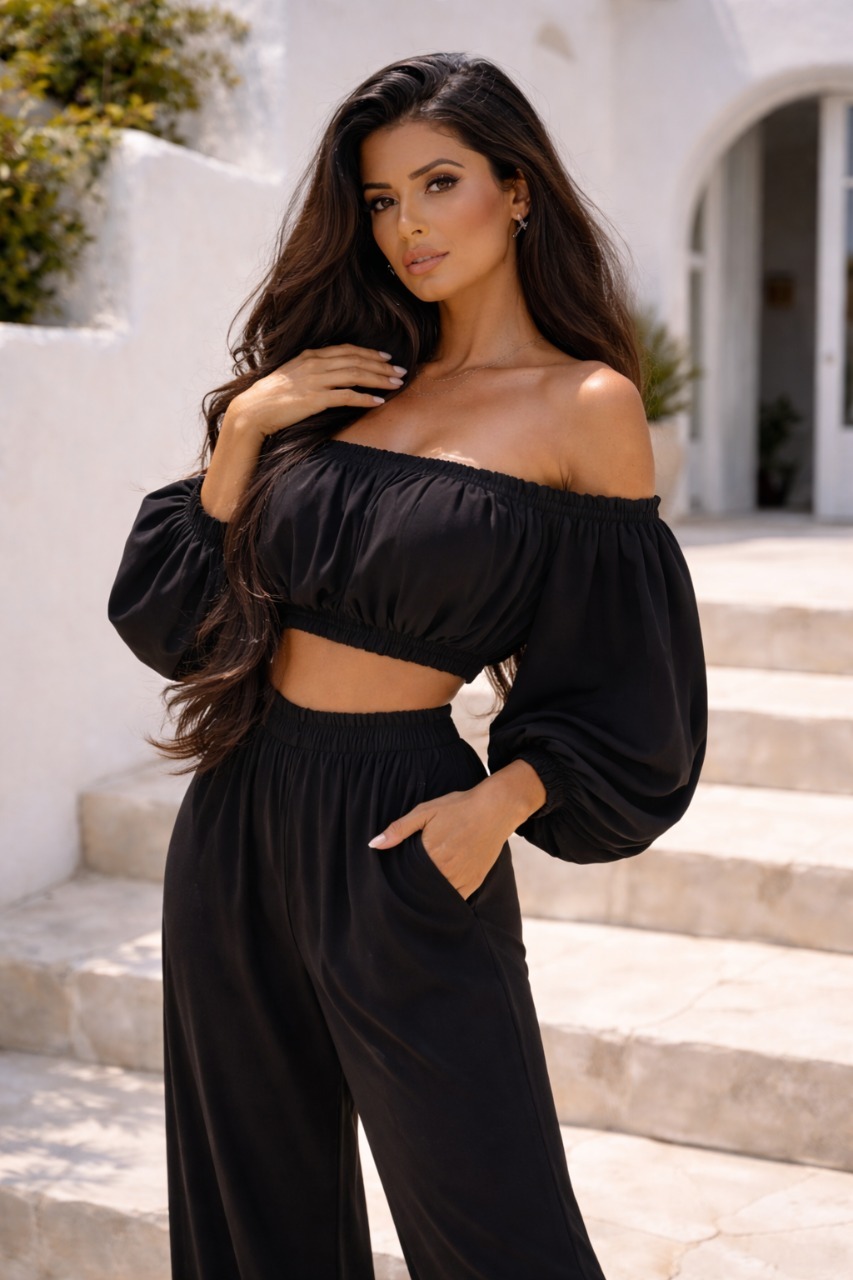 Легкая блуза с открытыми плечами добавляет образу романтичности и воздушности. Эластичная резинка на талии помогает подогнать блузу по фигуре, подчеркивая талию и создавая плавный силуэт. Свободный крой и объемные рукава делают этот костюм еще более легким и непринужденным, идеально подходящим для теплых летних дней.