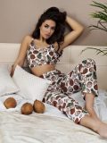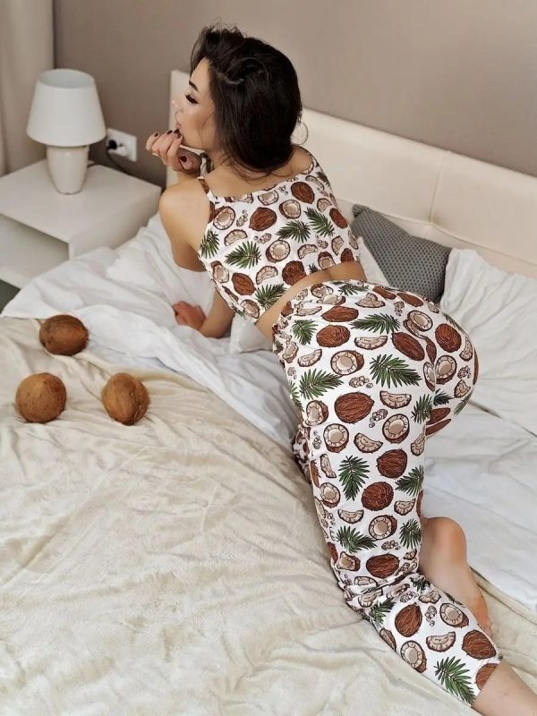 Пижама из хлопковой ткани повторяет изгибы тела, не стесняет движений. Трикотаж легкий и гигроскопичный. В комплекте идут удобные брюки и топ с принтом.