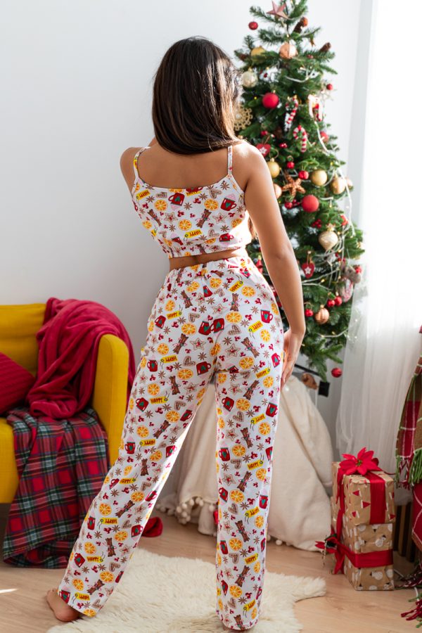 Пижама из хлопковой ткани повторяет изгибы тела, не стесняет движений. Трикотаж легкий и гигроскопичный. В комплекте идут удобные брюки и топ с принтом.