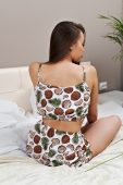 Пижама из хлопковой ткани повторяет изгибы тела, не стесняет движений. Трикотаж легкий и гигроскопичный. В комплекте идут удобные мини-шорты и топ с принтом.
