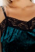 Невесомо тонкая пижама с мини-шортами на удобной резинке – обворожительная деликатность. Чувственная выразительность фестонного края контрастного кружевного рисунка настроченного поверх кромки декольте топа – роскошь неги. Комплект не дает усадку, практически не мнется, мягко облегает кожу, оберегая свободу движений – априорный комфорт.