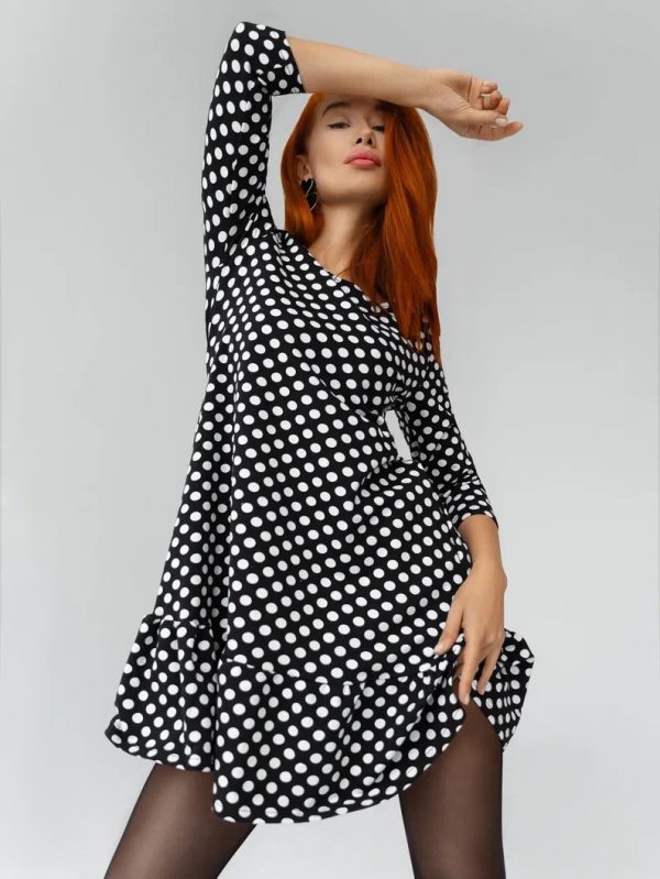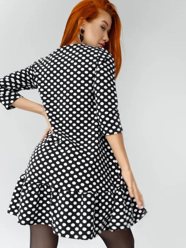Длина рукава ¾ добавит девушке строгости, а поэтому вещицу можно использовать как рабочий дресс-код. Но воланы по подолу наряда внесут немного мягкости в однообразные будни. Платье хорошо смотрится с темными сапогами, куртками и небольшими сумочками. Не стоит нарушать простоту кроя украшениями, они будут лишними.