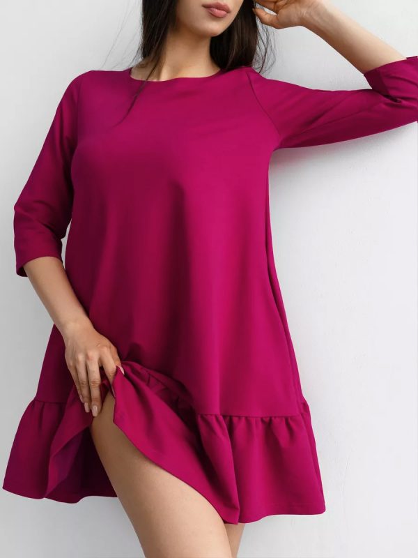 Красивый оттенок – это тренд предстоящего сезона. Длина рукава ¾ добавит девушке строгости, а поэтому вещицу можно использовать как рабочий дресс-код. Но воланы по подолу наряда внесут немного мягкости в однообразные будни. Платье хорошо смотрится с темными сапогами, куртками и небольшими сумочками. Не стоит нарушать простоту кроя украшениями, они будут лишними.