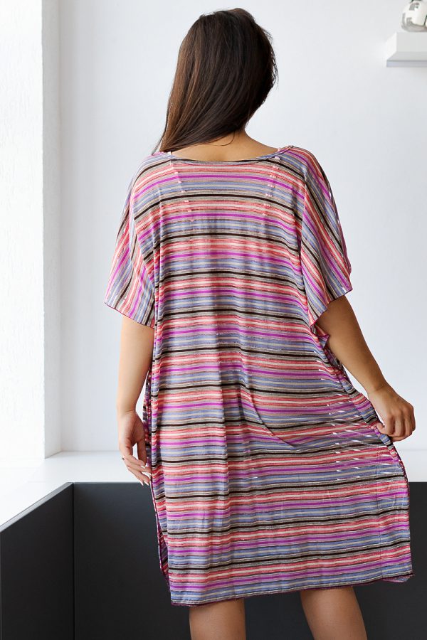 Легкий принт в полоску всегда уместен в пляжной одежде, он придает им романтичную ноту. Длина помогает чувствовать себя уверенной, скрывает особенности фигуры. В качестве застежки предлагается кокетливый пояс. Рукав ¾ актуален вечером, а днем с помощью него можно спастись от палящего солнца. Легкий вязаный трикотаж не нагревается от лучей и пропускает воздух.
