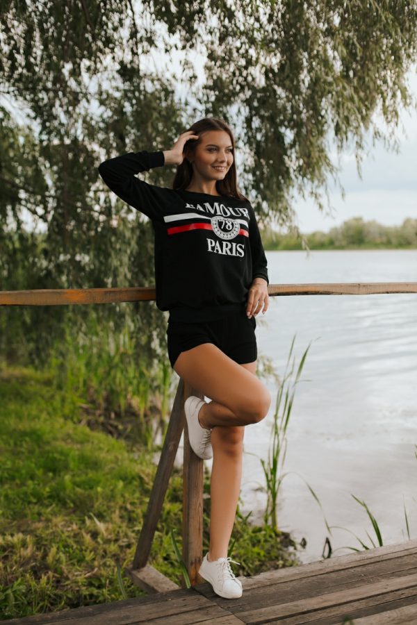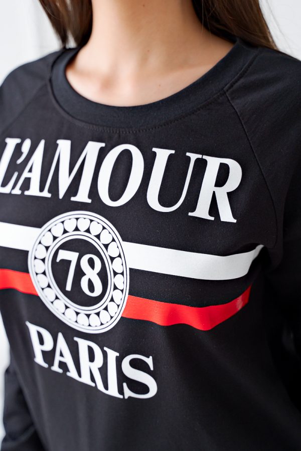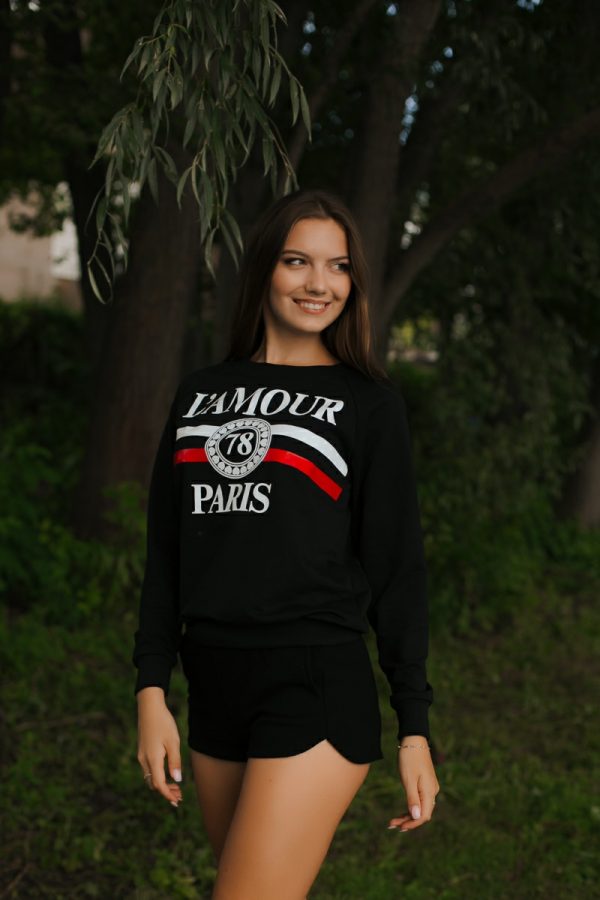 Молодежный спортивный Свитшот черного цвета для девушек с принтом «Париж». Изготовлен из футера.